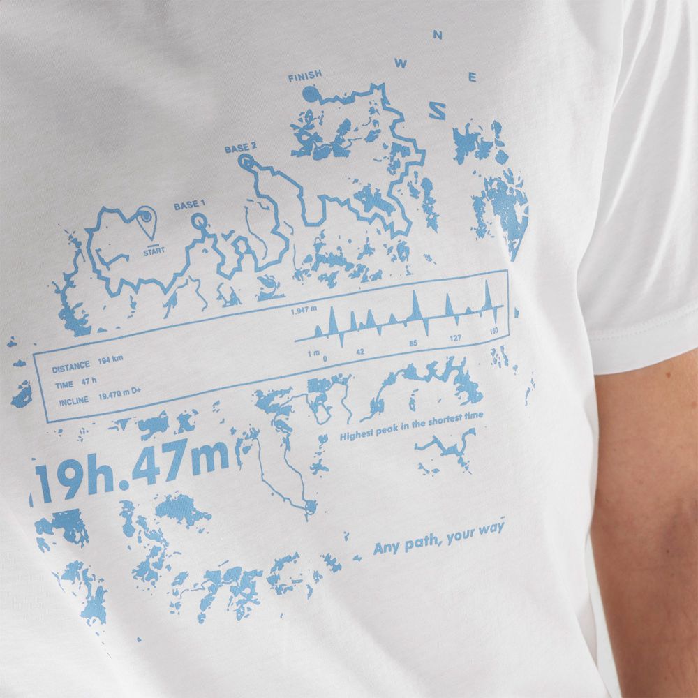 Celebrating our trail-running origins, the monochrome graphics depict the route and topographic lines of a trail Kilian Jornet ran in Norway...with Salomon-inspired performance statistics (1947 is the year we were founded). Made from soft organic cotton, it also pays tribute to the great outdoors as a limitless playground through inspirational texts like “Any path, your pace.”